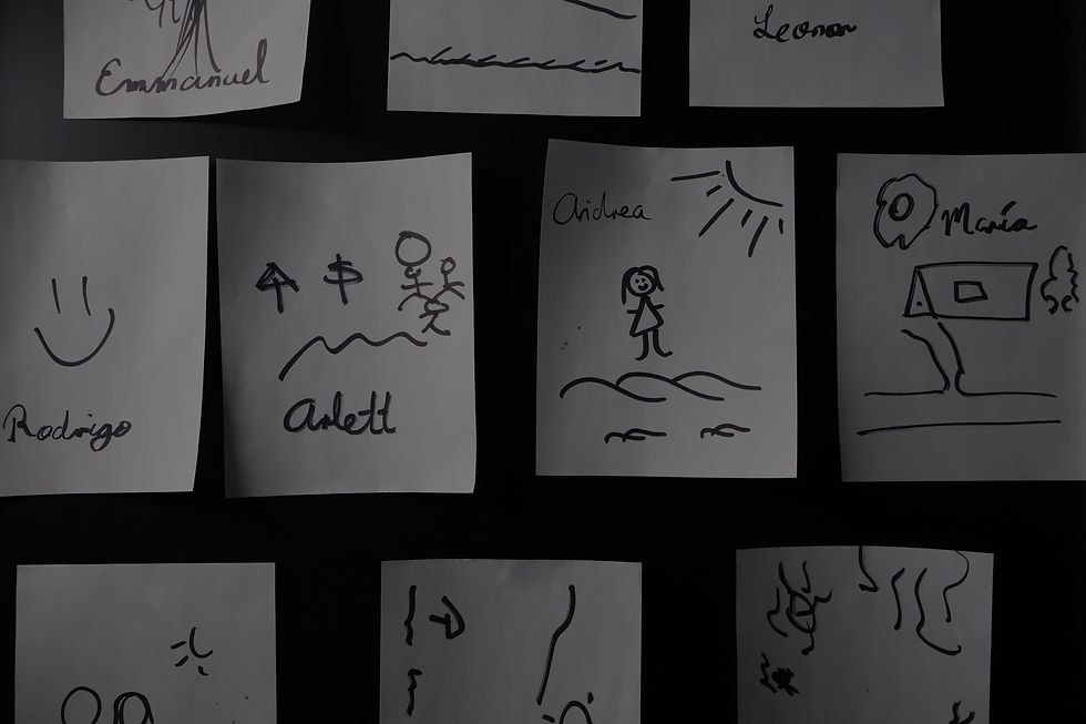garabatos, palitos, soles, casas, olas, montañas, familias, campos, aviones, playas... dibujos de niños. Y eso fue exactamente lo que más nos impactó. Cuando no hay tiempo de pensar, somos más auténticos.